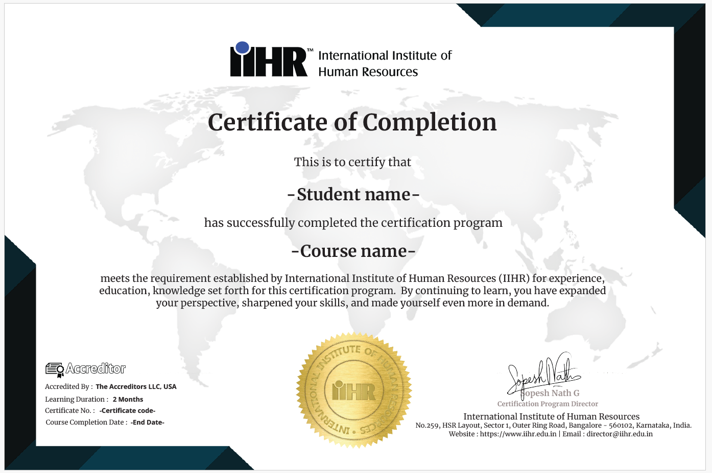 Upon successful completion of the course, participants will receive a Course Completion Certificate from the International Institute of Human Resources (IIHR).